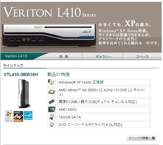 WindowsXP搭載のPC 購入しました。ACER製の超コンパクトサイズのデスクトップPCです。
